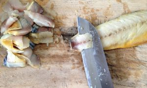 鱼切片。从鱼头向鱼尾切。鱼用盐、料酒、花椒末腌一会。