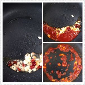 油烧热然后转小火,放入葱、姜、蒜、一把花椒、干辣椒(干辣椒要细长的才辣,炒菜前用水泡一下辣椒辣味更浓郁,而且不会炒糊)然后小火多炒一下