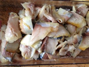 把鱼肉鱼骨分开腌制半个小时。鱼骨腌制放:料酒、姜片、大葱葱片、花椒、辣椒面、盐。鱼肉腌制放:红薯粉(调料包里一包都有)姜片、大葱葱片、料酒、辣椒面。