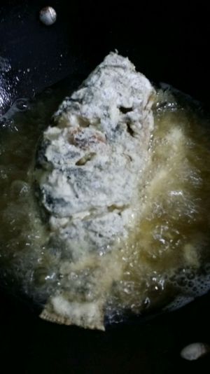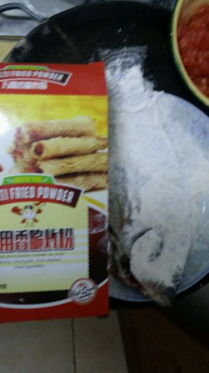 然后把鱼块全裹上面粉,面粉可加个鸡蛋一起裹上糊糊!