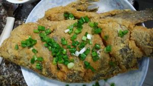 第五步,等油热把鲤鱼放进锅里,醋倒鱼身上去腥。