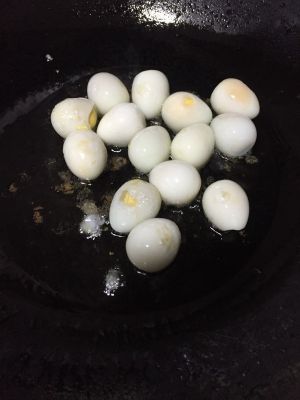 半小时后放炸好的鹌鹑蛋,在小火烧半小时,放冰糖大火收汁,翻炒下,金银剔透的红烧肉就出锅了