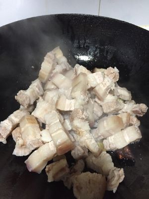 五花肉切成1.5CM大小,冷水煮过捞出,放入佐料炒制过的锅里,不断翻炒,以免粘锅