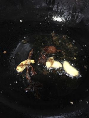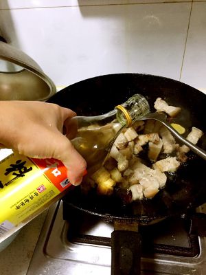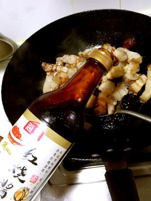 1:然后五花肉上点适量的老抽调色,拉油一遍 稍微久一点。感觉肉身缩水四面变色焦黄捞起,2:爆姜块把五花肉一起慢火煎炒 要勤翻。加少许的料酒,再把糖色加入继续翻炒,3:加入适量的水,刚好过面就行。放入香叶 草果 桂皮 大葱,还有加盐 白糖 生抽 老抽进行调味 调色。。4:小火闷软(30分钟左右),也可以高压锅大火上汽压3分钟关火闷2分钟即可,开锅。