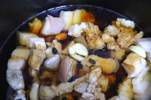 电饭锅底铺一层生姜片,码赏五花肉,加50g红烧汁,再倒水没过肉放入蒜瓣和豆豉。