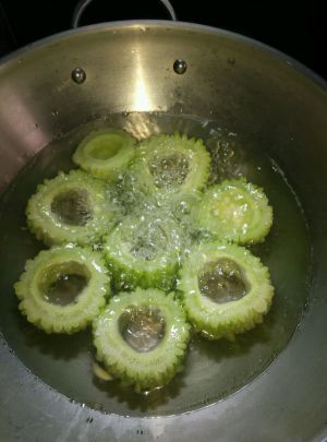 一个个挖好的苦瓜圈摆入盘中。注意白色的瓤是苦味的来源,一定要挖干净,挖干净就不苦了。