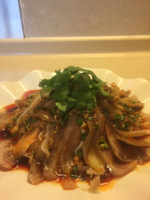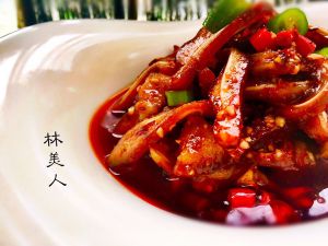 罗汉笋垫底,猪耳朵摆成大风车,味汁可淋入或搅拌均匀,装盘开吃了