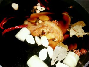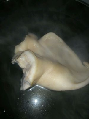 重新入锅,注入开水以没过猪耳朵为限,加入香料,老抽,20ml料酒煮沸,改小火煮40分钟关火,闷两三个小时!
