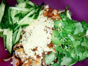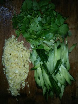 香菜切段,黄瓜切丝,10瓣大蒜剁碎!