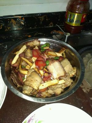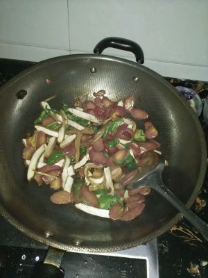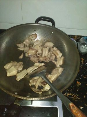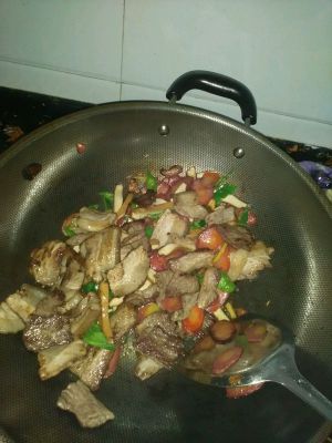 5.待炒熟后再倒入刚刚煎好肉,翻炒,放适量的食盐。