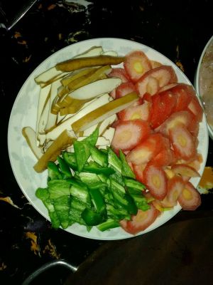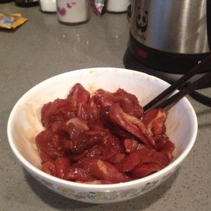 肉切片儿。放入少许料酒、生抽、糖、淀粉,和匀备用。