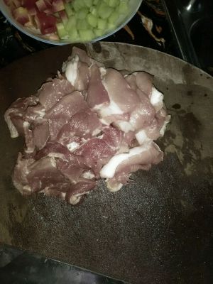 将肉切成长约5CM,宽为3CM,厚为0.3CM的薄片(你可以将肉稍冻一下再切);蒜苗切段