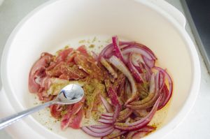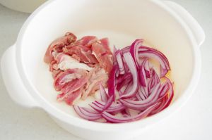 瘦肉切薄厚适中的片,洋葱切丝(洋葱可以不要或者换成葱姜丝)。