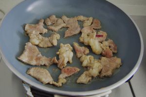 3.将切好的肉放入油锅煎熟,捞起来放在一旁。