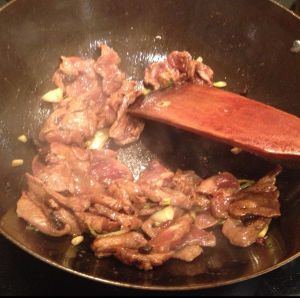 热锅冷油把肉片滑散,炒白出水汽的时候,放一勺料酒(米酒,二锅头都可以)