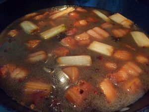 加入没过五花肉的水大火烧开,撇去浮末,加入料酒转小火炖煮一个小时