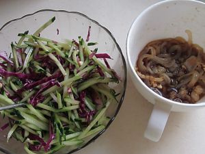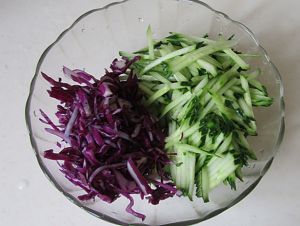 将黄瓜, 紫甘蓝分别切成丝备用;