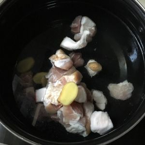 将五花肉切小方块,放入凉水,加姜片,开火焯,不要盖盖子,否则肉腥味散不掉