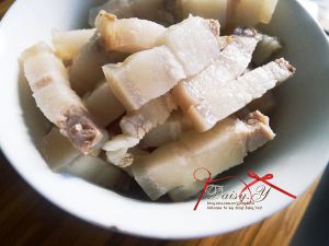 趁煮蛋的时间切五花肉成块状