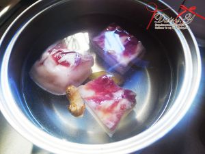 提前把黄豆泡好,五花肉切块,把五花肉放在水里焯一下,撇血沫。捞出。