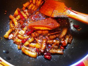 锅里放油,粮油放入冰糖,冰糖彻底化开起泡沫,倒入五花肉翻炒,上色均匀后,放入葱姜,花椒大料,香叶桂皮,辣椒翻炒一下,放入黄豆,倒开水多一些