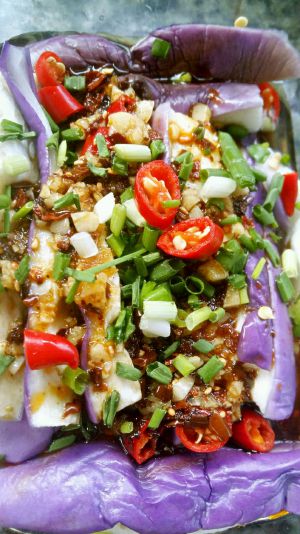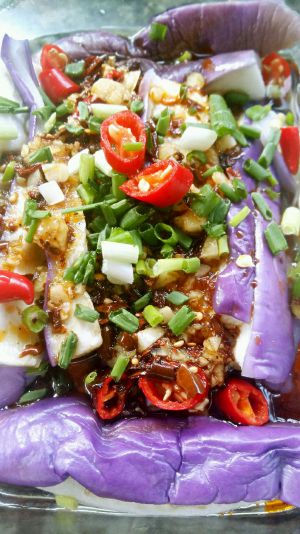 切好茄子上锅蒸十分钟,拿出来撕成条放入大碗中,大蒜切沫泡椒切细,放入小碗中,热锅下油,大火烧至锅中冒浓烟关火,把热油浇到碗中的蒜沫和泡椒中,炸得滋滋响,再把小碗的油倒入大碗茄子条碗中,再加入蚝油,生抽,老抽,芝麻油,也可以放入少许香醋(不喜欢吃醋的可以忽略)老干妈(如果喜欢吃辣椒的可以多放一些),拿筷子翻拌均匀即可开动,比红烧茄子下饭得多,不用油炸,热量不高,很适合三高或者减肥的群体哦