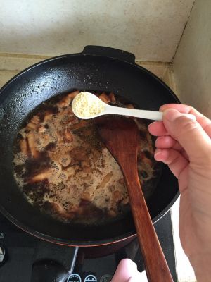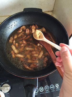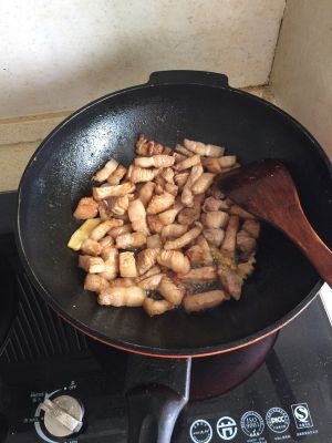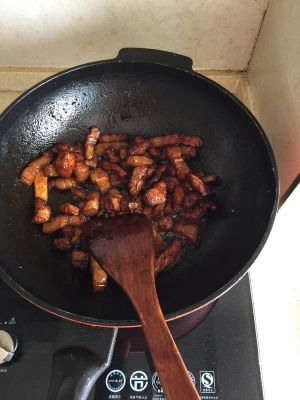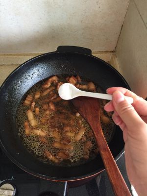 七成熟放老抽(多炒一会、这样肉里的油可以炒出些吃起来不腻)