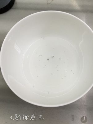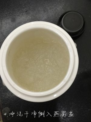 将撕开的燕窝丝放在炖盅里,倒水末过燕窝1cm