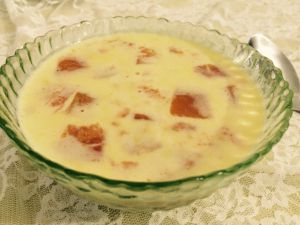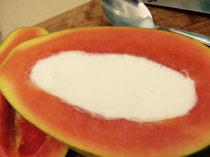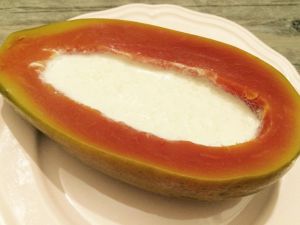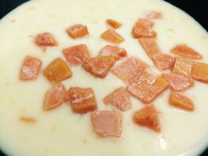 牛奶放锅煮滚(熟的木瓜很甜不需要放糖),放木瓜粒,煮5分钟