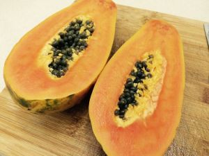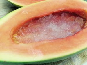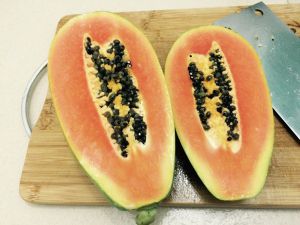 木瓜切两半去籽,一边大一边小,小的作为盖子,大的作为碗;