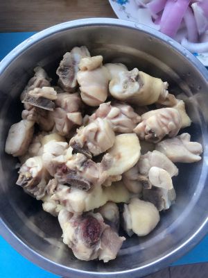 鸡肉焯水:鸡腿切块儿,清水洗净,凉水下锅,放入3片姜、料酒,待水开后再焯2分钟,捞出过凉水备用。