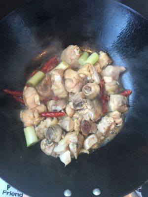 锅里倒少许色拉油,热锅凉油,放入焯水过的鸡,轻轻煸干肉里的水份,要不停的炒