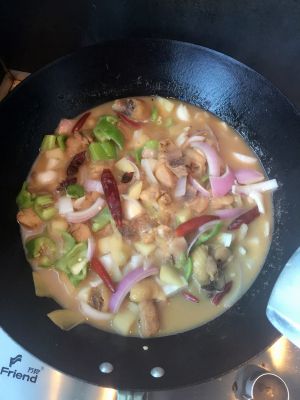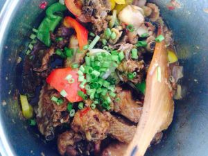 鸡块小火炖25分钟,依次放入土豆,洋葱,绿辣子(土豆块熟的时候再放入洋葱和绿辣子)
