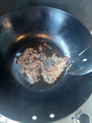 热锅凉油放入花椒,来回搅拌花椒,入味,待油热冒烟时,关火,捞出花椒。