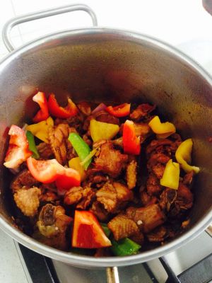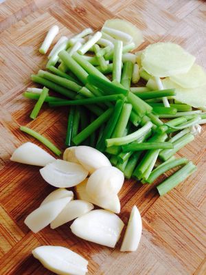 煸炒完了再加入葱姜蒜,如果喜欢辣的,这时可以加大量干辣椒,喜欢味重的,葱姜蒜的量可以加多两倍