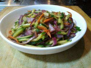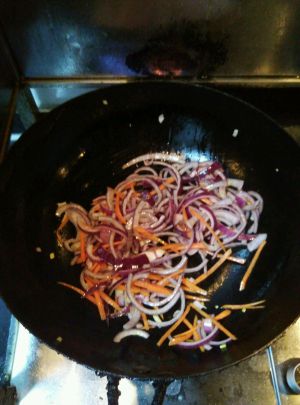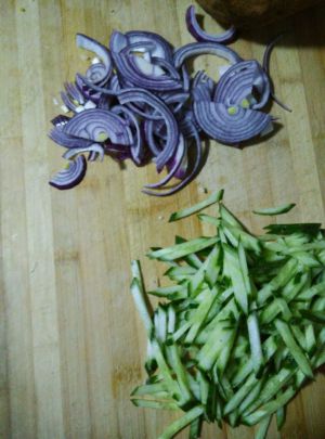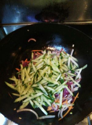 热锅凉油煸圆葱跟胡萝卜丝,稍断生放黄瓜丝;