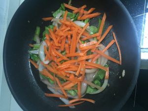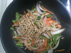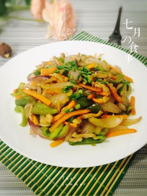 加入胡萝卜丝和尖椒丝,翻炒一分钟。