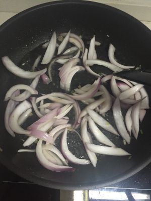热锅加适量橄榄油,先放入洋葱丝、火腿肠丝和姜蒜末炒出香味;