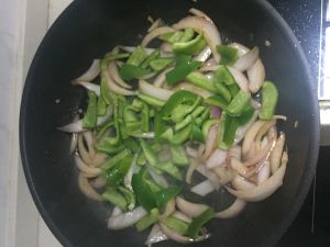 洋葱有一定程度软度后 加入青椒一同翻炒