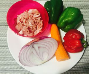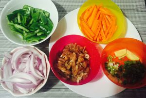 准备好主要食材: 肉丝、青椒、洋葱、胡萝卜