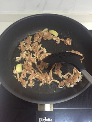 有葱香味出来后 放入腌制好的肉丝爆炒 红色变白色 并且有肉香味后盛出
