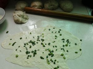 然后拿出面团,用手分成一份份同等大小,在板子上涂上油,用棍子扞开,抹上葱花。再从边边卷起来,折叠成一个圆形。