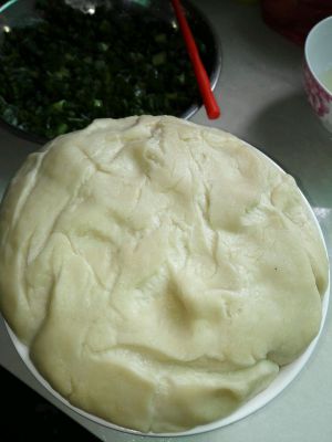 把面粉倒入容器里,倒入热水,搅拌均匀,再加入冷水,揉成面团。表面抹上油,放置2个小时,让面团发起来。