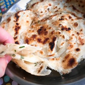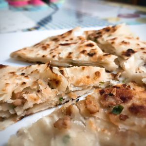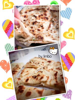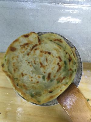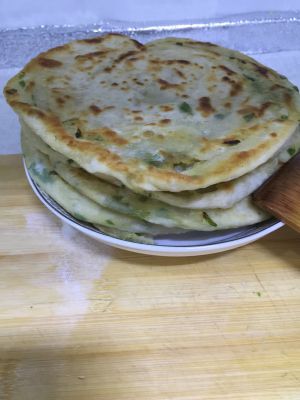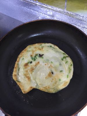 用擀面杖擀成薄片,上油锅煎至两面金黄,用筷子两边撩一撩,这样饼就会一层一层的松开了