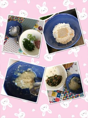 把面粉倒到碗里 加上切碎的葱 倒入凉白开 调成很稠的浆