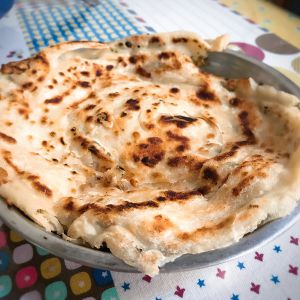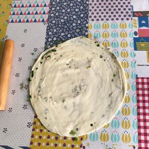 和好并醒好的面粉擀成薄面饼,撒上盐、油、葱花,涂均匀。