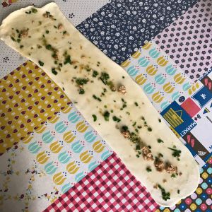 取出一半擀成如图薄长片,刷上油酥和肉末葱油,横着叠起来