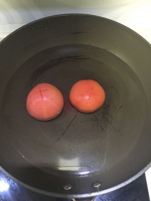 西红柿切十字花刀,放入煮沸的水中烫一下