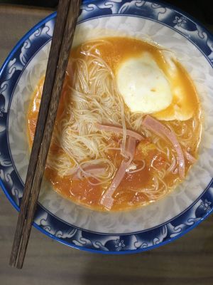 起锅放少许小葱,就一碗香喷喷的西红柿鸡蛋面做好了(吃的时候可以放辣椒酱,米醋,根据个人口味而定)