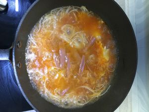 水烧开放面条,等水再次开的时候放半碗冷水下去,如此反复3次放冷水,这样煮出来的面很筋道